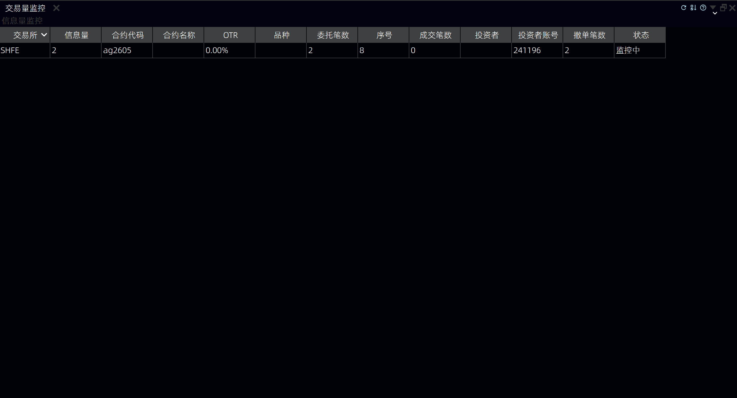 打开交易量监控 - 点击菜单栏中的 "监控" -> "交易量监控" - 或在工作区中选择 "交易量监控" 标签页